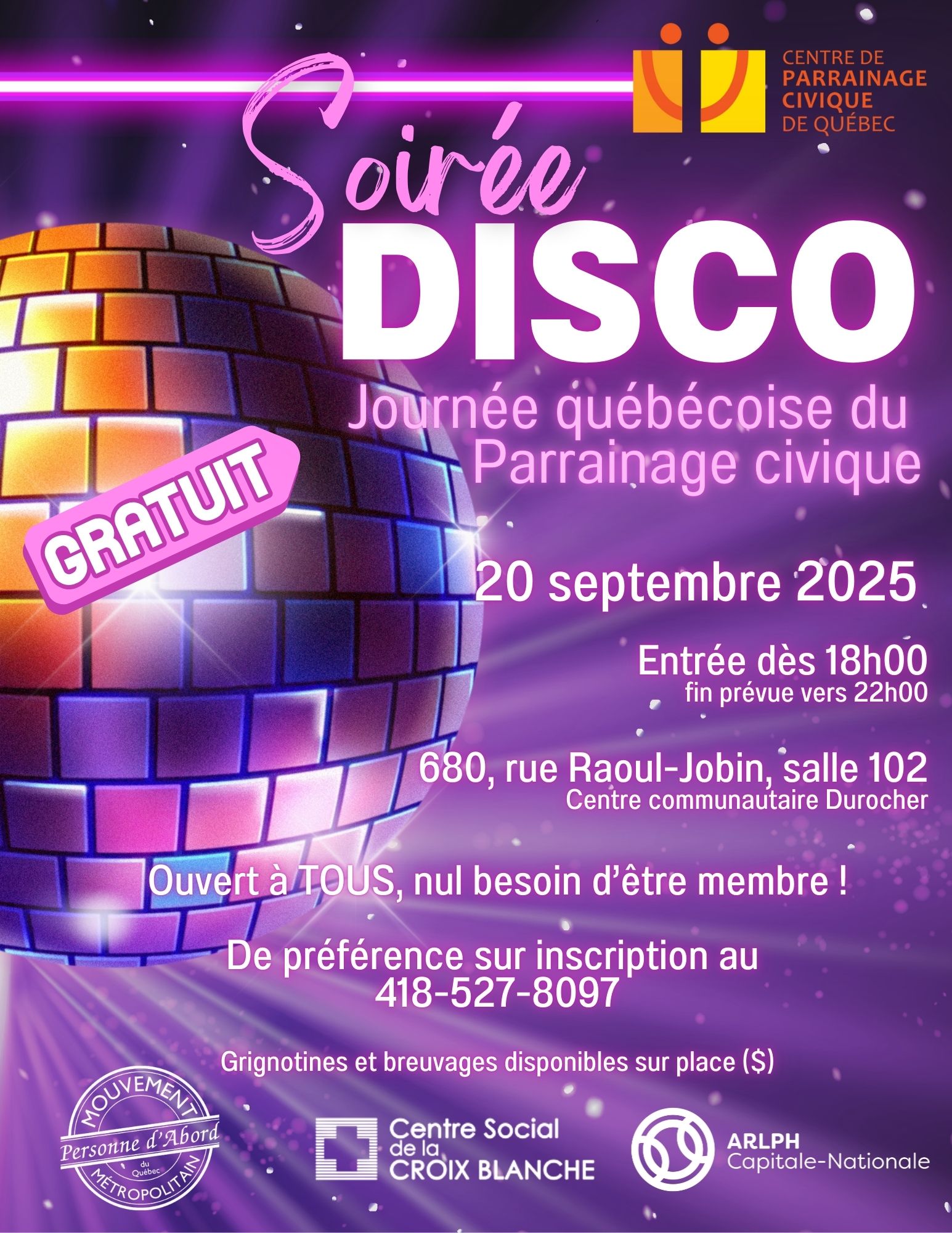 Le Centre de parrainage civique de Québec vous invite à une soirée spéciale Disco pour célébrer la journée québécoise du Parrainage civique!